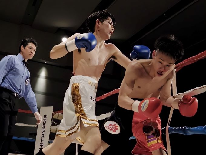 3回、正本選手は右アッパーを好打。しかし、ここを踏ん張った真斗は豊富な手数で押し返し譲らず。